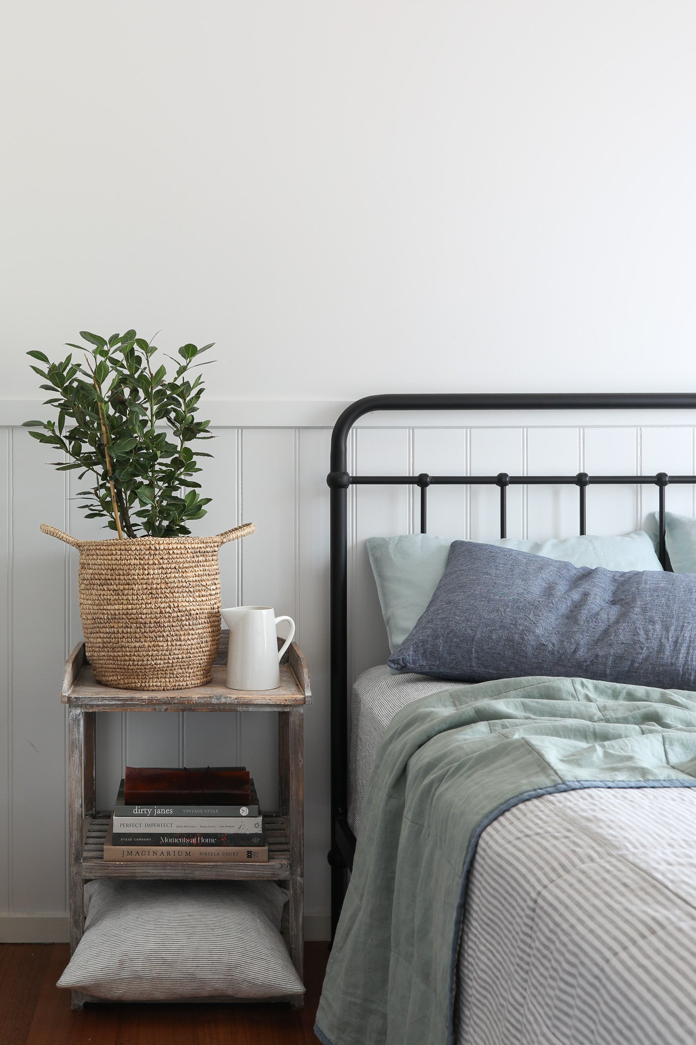 Our Sage & Grey Stripe French Linen Quilt is double sided so you can style it your way. Sage base on one side and a Grey Stripe on the reverse with a Lake Blue border.